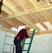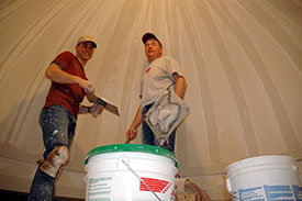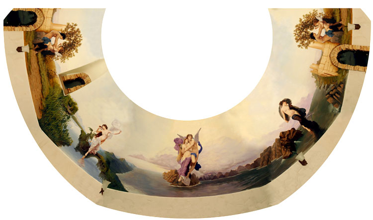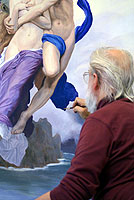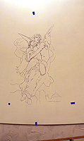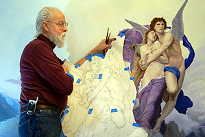 laying out of the cartoons for the artwork. When trying to decide which of the old world masters works to copy; I was fortunate to discover the ARC web site, for the uninformed this is a virtual art museum which contains many thousands of pieces of art, with art history and copies for sale. The artist I chose to copy was William Bouguereau a French artist whose skill made for the most challenging teacher of flesh color and composition I could find. He also had a sunrise and a sun set painting that I could place on the east and west sides of the tower and then it was to decide on the north and south sides, which ended up being a Young Girl Defending Herself Against Cupid on the north and the Rapture of Psyche on the south. Once that was decided on the most challenging part of the mural was to blend all four of Mr. Bouguereaus paintings together in a pleasant manner. This part took many repaints and re working as one area would turn out great but would not blend in with the next section. Most muralists eliminate this problem by simply placing scrollwork panels around each section separating them with smaller panels in between filled with background composition, but I chose the hard way and linked each together in a continuous flow. What a great way to appreciate an artists work and also a wonderful way to learn from a great man who has been gone for a century. |