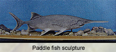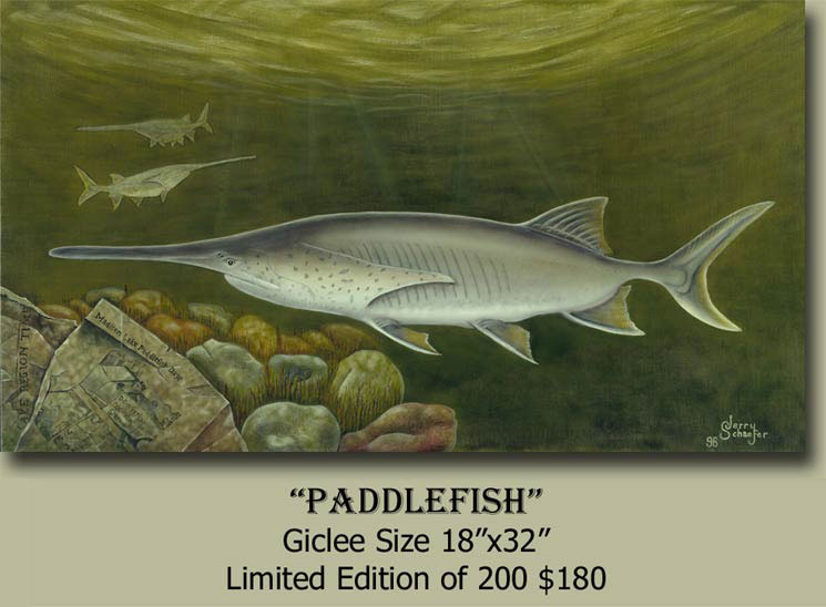 Painting of paddlefish and the Madison Lake regions Times newpaper, headline the Paddlefish celebration held each year the fourth weekend in July. Model used in this painting is a sculpture by Schaefer Studios, MN. The paddlefish remains were discovered on the shore of Madison Lake by Ron Abraham in the spring of 1989. The fish measured 65 1/4" with an estimated weight of 100lbs and was 35 years of age. |