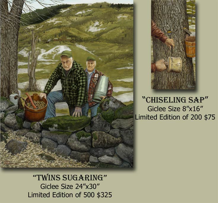 Memories of maple sugaring in Vermont. *Note the old repair in the stonewall, the old dead maple with the telltale burl left by the ancient chisel method of sap gathering. Also note the badly burned hand, the result of steam from the sugarhouse. In addition there is a hidden chipmunk for the kids to enjoy. |