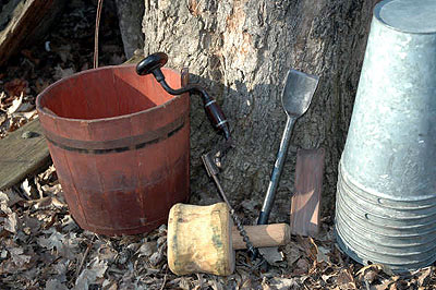 | A recycled wooden bucket which first saw duty as a pail then with a broken stave handle area, it was recycled into a sap bucket, then later in the painting recycled again, it is shown being used as a tool bucket with an updated rope handle. Also used in the painting is the brace and bit belonging to my grandfather. Braces of this short crank type were used for drilling maple trees because of their speed. Also shown are the galvanized sap buckets and the very old wooden mallet and chisel used for cutting a very ugly scar in which the wooden spout was placed as shown in the companion painting CHISELING SAP. |